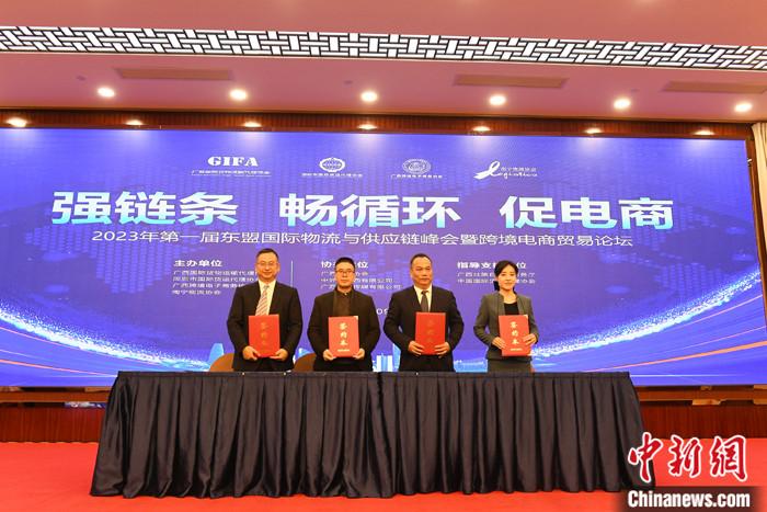 中新社南寧3月9日電 (記者 林浩)“今年,隨著《區(qū)域全面經(jīng)濟(jì)伙伴關(guān)系協(xié)定》(RCEP)深入實(shí)施,跨境電商業(yè)務(wù)加快發(fā)展,廣西與東盟物流量有望迎來(lái)增長(zhǎng),我們將引導(dǎo)更多會(huì)員企業(yè)布局廣西,搶灘東盟市場(chǎng)?!?月9日,中國(guó)國(guó)際貨運(yùn)代理協(xié)會(huì)副會(huì)長(zhǎng)兼秘書長(zhǎng)李志民說(shuō)。圖為論壇現(xiàn)場(chǎng)舉辦相關(guān)合作簽約儀式。 中新社記者 林浩 攝當(dāng)天,202